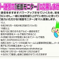 南アルプス市商工会の広報誌『アルピー通信』をますますパワーアップさせていくため、みなさまの声を紙面づくりに活かし、一緒に地域を盛り上げていきたいと思っています。そこで、ご協力いただける「紙面モニター」を10名募集します‼ …